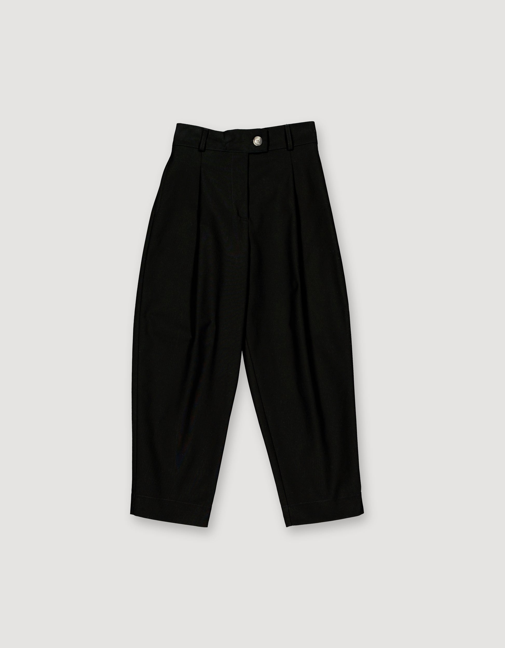 The pleated black trousers are crafted from crisp Japanese cotton canvas from the LVMH Group deadstock fabric depot. The high waist trousers feature side pockets, one back welt pocket and belt loops, a zipper fastening with a horn imitation button from biodegradable resin. The elastic waist band at the back adds to comfort.