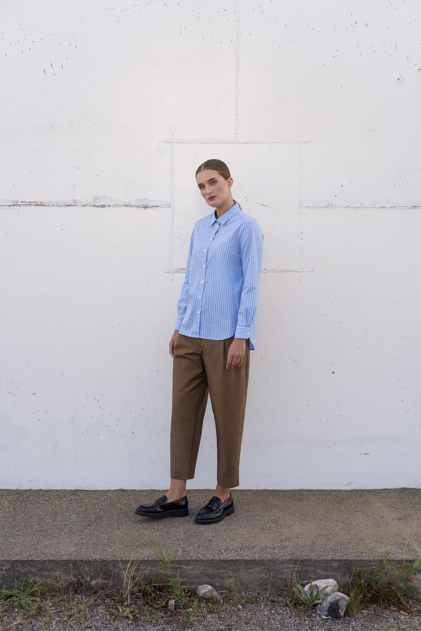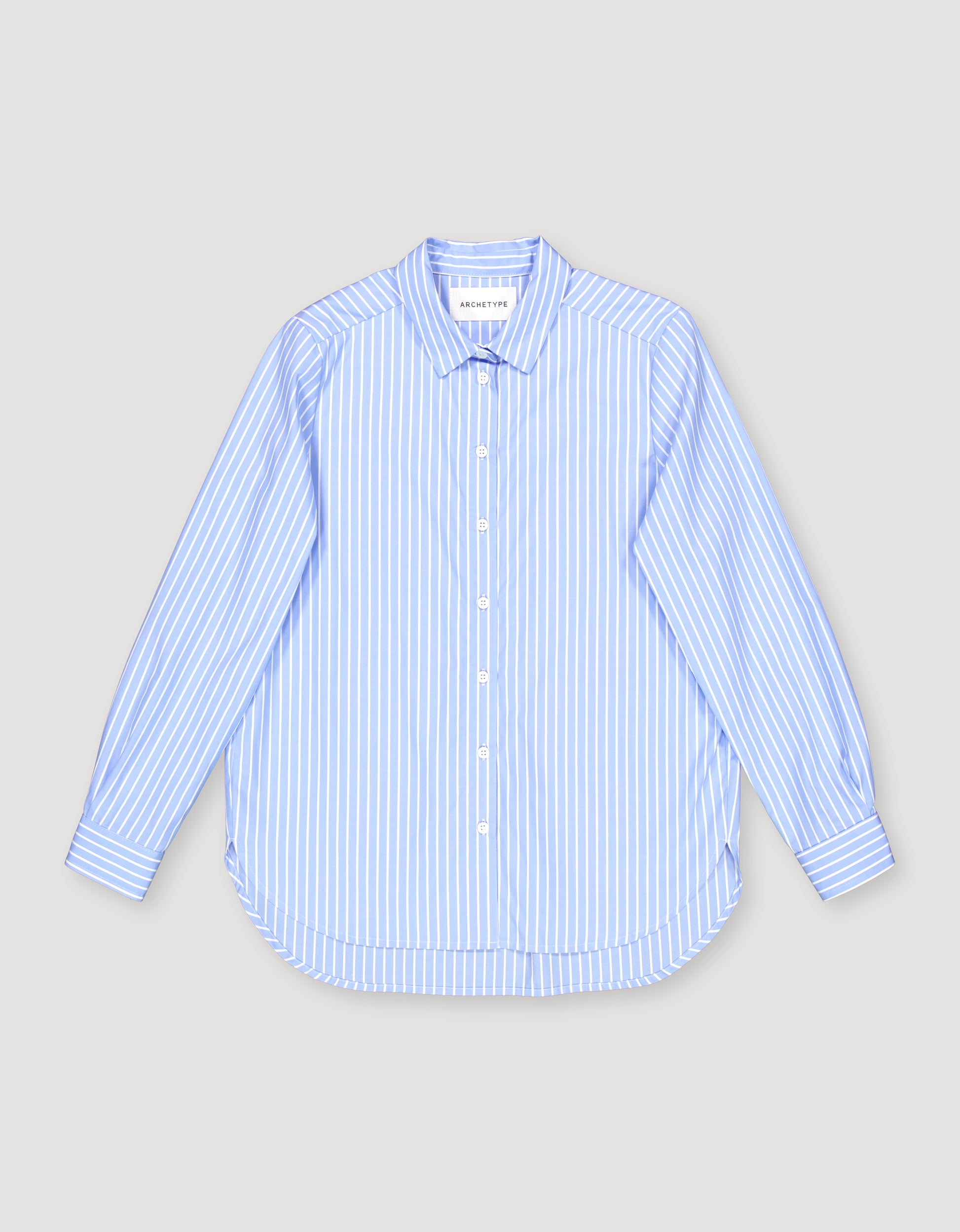 The basic shirt with a classic fit, is a certain staple in any wardrobe. The button up shirt has a rounded hem which is longer in the back. The material is a striped crisp cotton and the shirt has natural white river shell button details.