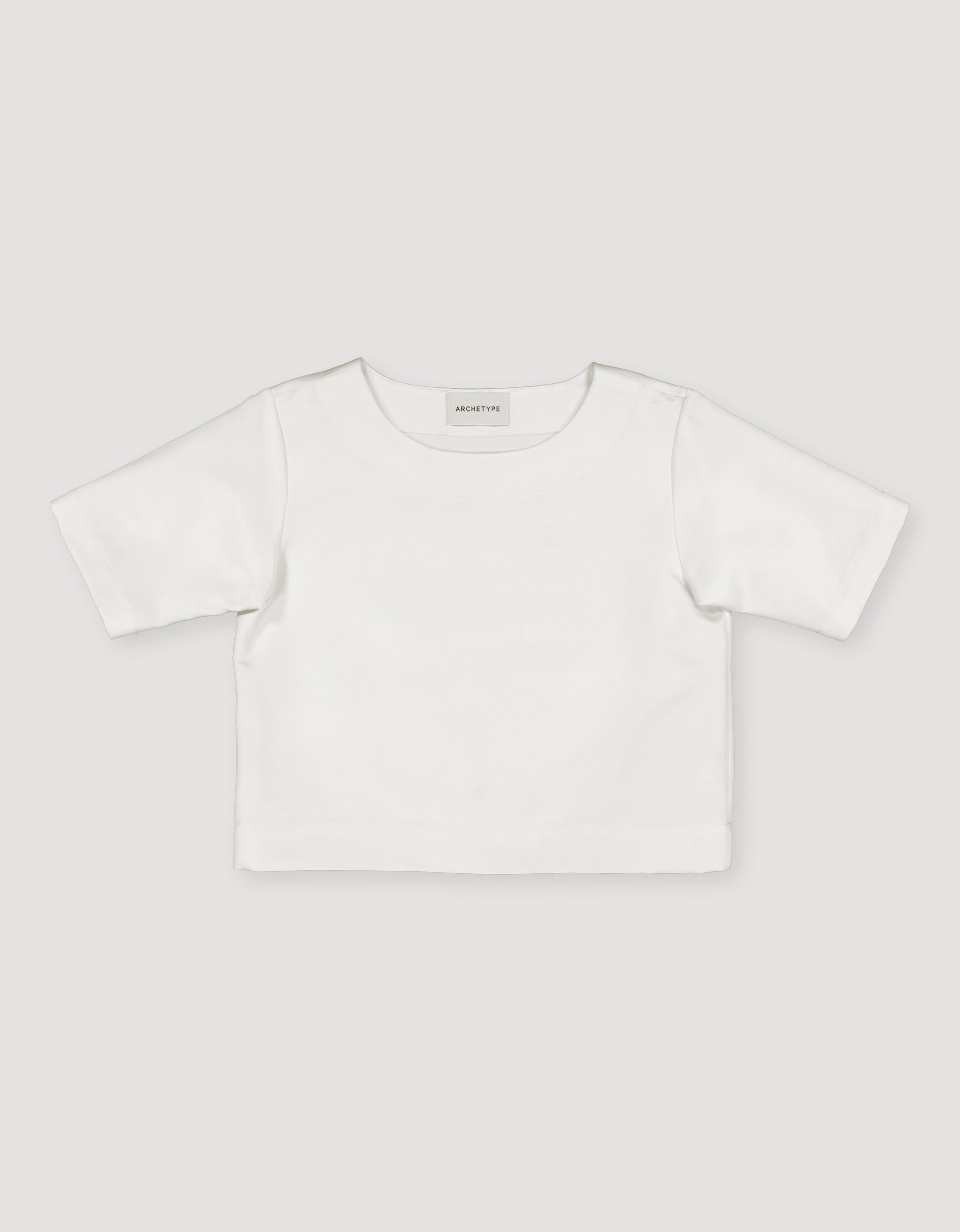 The cropped shirt is made from heavy silk fabric in ivory color. The fabric is an exclusive dead-stock fabric from LVMH Group. The shirt model is our collection staple with a boxy minimal cut and a modestly cropped hemline.