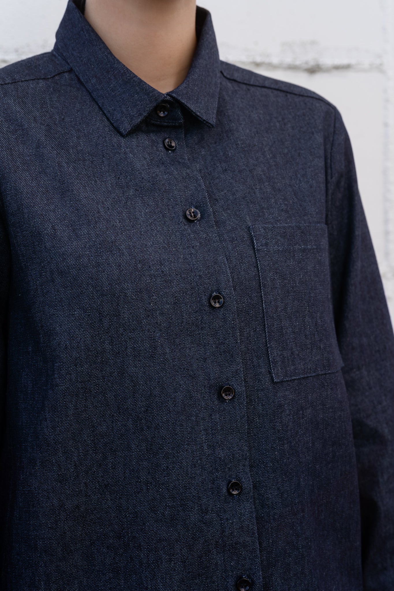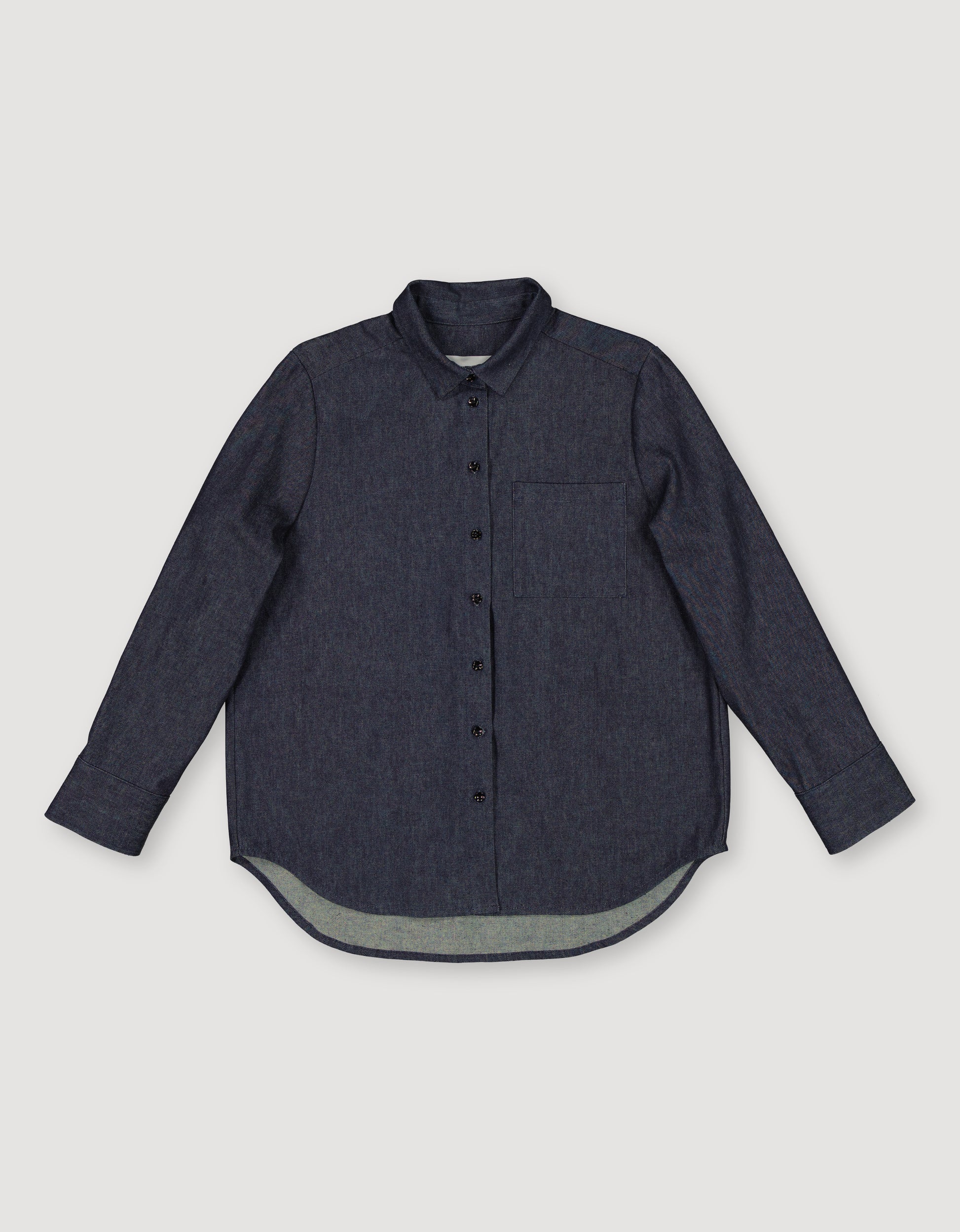The relaxed-fit shirt is crafted from indigo hemp & organic cotton blend. The denim shirt features straight cuffs and a single breast pocket. Perfect for wearing in layers.
