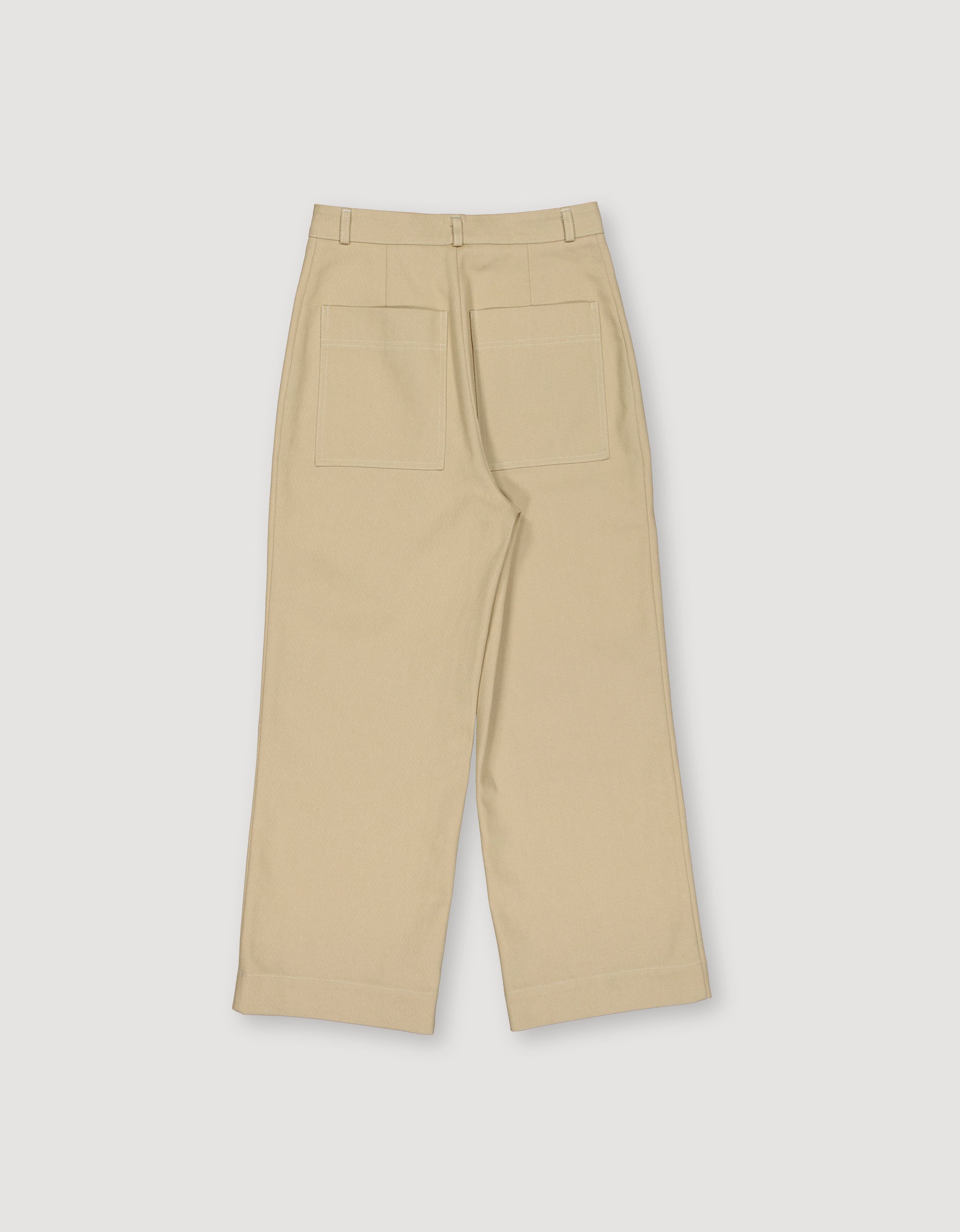 The beige twill trousers are crafted from heavy cotton. The trousers are fitted at the waist with otherwise relaxed straight silhouette and cropped length, belt hoops and patch pockets in front and back.