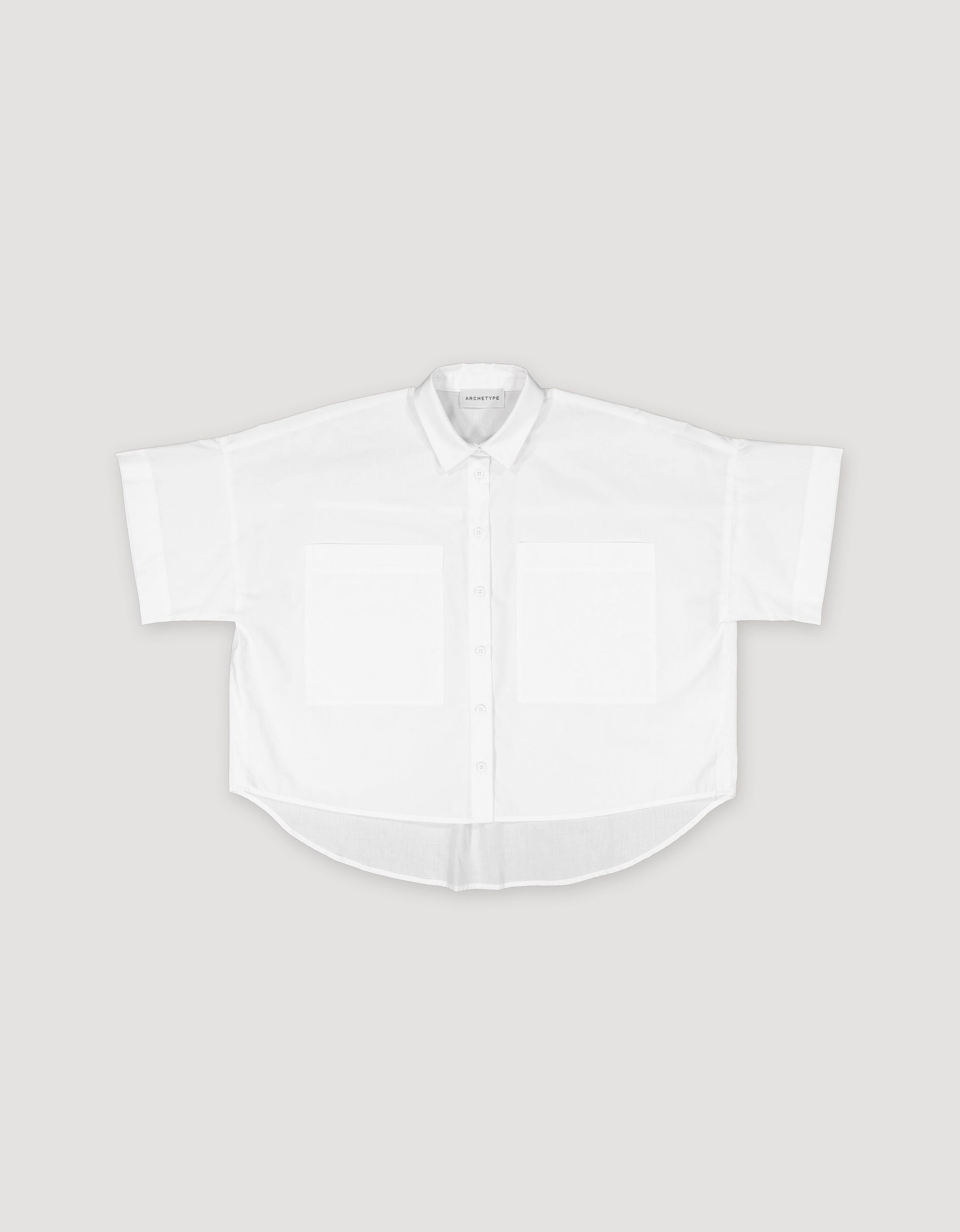 The loose, boxy-cut shirt with short sleeves is crafted from opaque, matte paper-touch cotton poplin. It features two large front pockets, a back pleat, and a high-low hem.