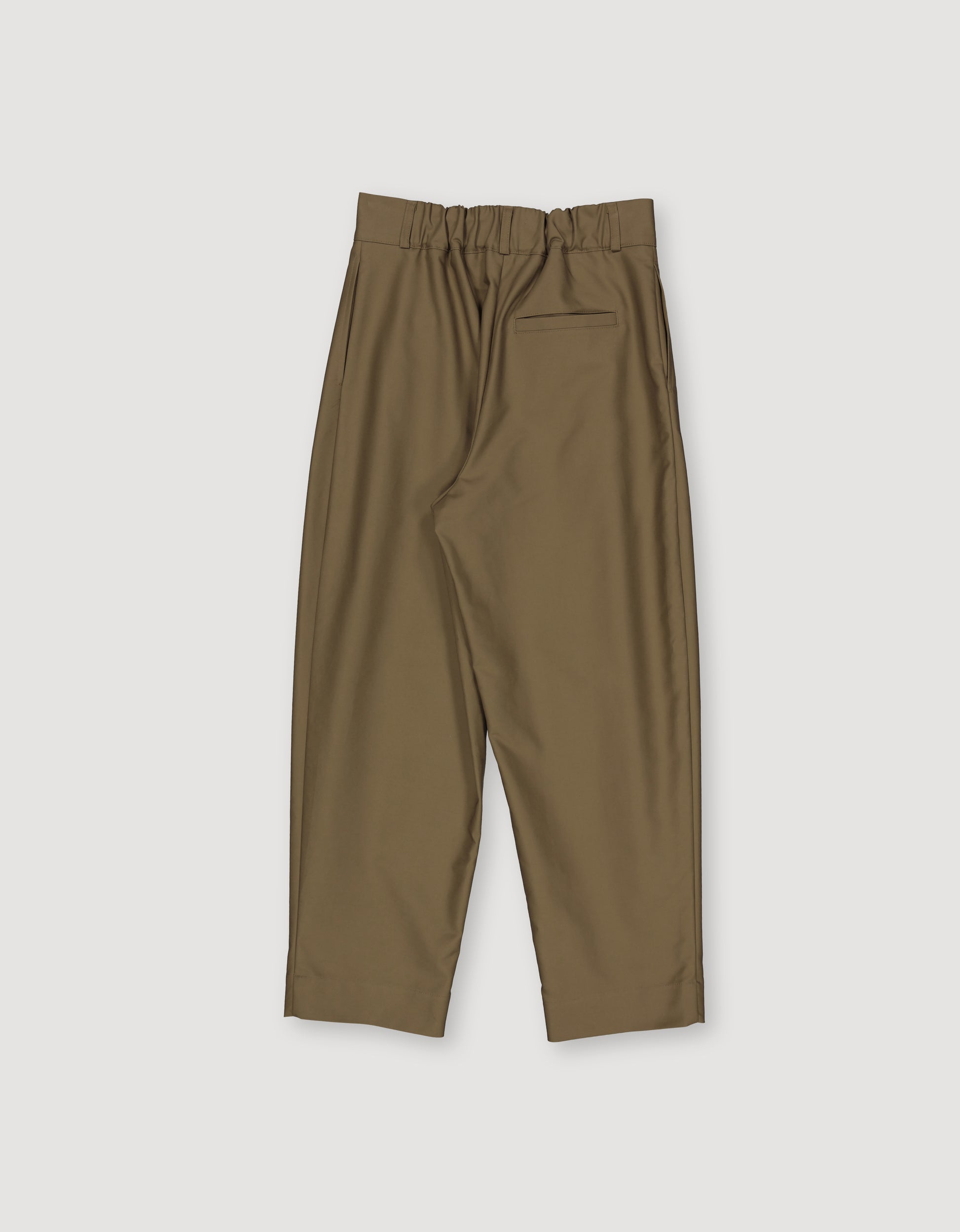 The pleated brown trousers are crafted from cotton with a subtle sheen. The trousers sit high at the waist with a relaxed, easy silhouette and a cropped length. Elastic waistband at the back enhances comfort.